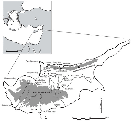 - Steel, L. Cyprus before History. From the Earliest Settlers to the End of the Bronze Age; Duckworth & Co. Ltd.: London, UK, 2004; ISBN 9780715631645. [Google Scholar]