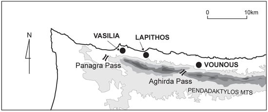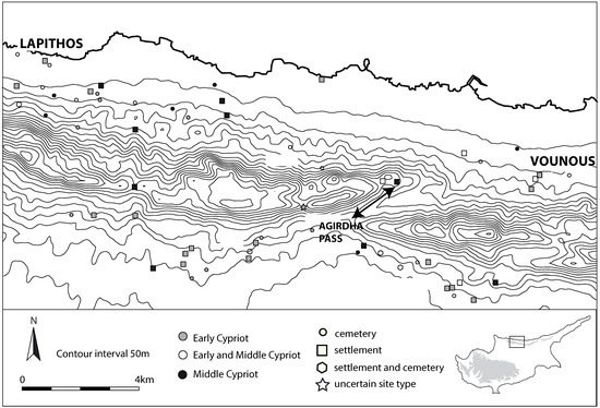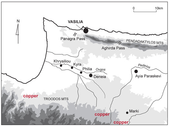 The north coastal strip is, however, nowhere wider than 5 km (Figure 3). This is likely to have inhibited the longer-term potential for population growth and systems elaboration in favour of sites with larger sustaining areas [31] (p. 32, n. 19). Other disadvantages of the north coast include its physical isolation behind the precipitous slopes of the Pendadaktylos Range, its distance from the island’s copper sources and the need to control the passes that are the only overland routes south to the Central Lowlands. It is clear, however, that the geostrategic importance of the north coast, i.e., its proximity to an inter-regional maritime trade network which stretched between the Levantine coast and the Aegean basin via the southern Anatolian coast in the third and early second millennia (see, most recently, [32] (pp. 78–79, Figure 14)), was of paramount importance; and that mechanisms were in place that enabled north coast communities to overcome these disadvantages at least during the Philia EC and MBA.