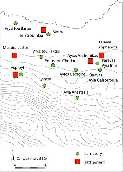 The importance of the north coast in the first phase of the EBA, the Philia EC, is well-known and it is likely that it was the initial point of entry for incoming groups. Vasilia, located northeast of the Panagra Pass and in command of an ‘excellent harbour for primitive craft’ [41] (p. 297), was clearly a major settlement. While it remains unexplored, surface indications and the great extent of associated burial grounds suggest it was of considerable size [24] (pp. 116–117), [42] (p. 25), [43] (pp. 180–182), [44] (pp. 206–210, Table 10). Similarly, the elaborate construction of several chamber tombs contrasts sharply with the majority of small pit tombs, suggesting considerable socioeconomic inequality [40] (pp. 61–64), [42] (pp. 25–39).