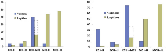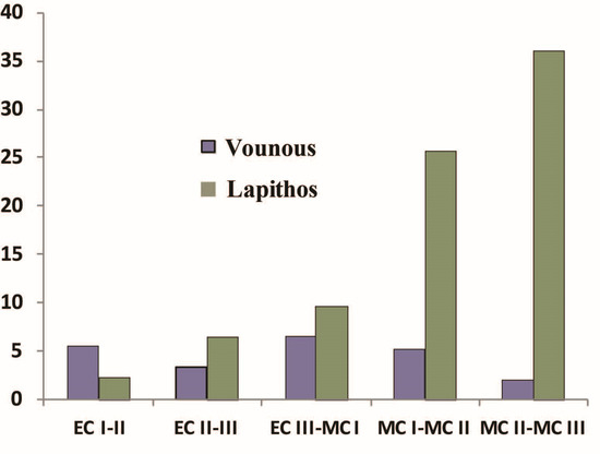 The earliest tombs at Lapithos date to EC II. The site, however, remained relatively small until EC III. At this point, Lapithos and Vounous are likely to have come into competition for land and other resources. The re-emergence of an external demand for Cypriot copper at the beginning of the MBA is also likely to have played a critical role, with Lapithos better placed to take advantage of this resurgence of seaborne trade. It appears to have become pre-eminent during MC I, by which time Vounous was in decline, with settlement ceasing here in late MC II. The shifting fortunes of these two sites are reflected in the relative quantity of metal deposited in the tombs (Figure 9). Metal is more common at Vounous in EC I–II (when it was the dominant site in the region), there is little difference between the two sites in EC III–MC I (when they had reached a position of potential rivalry), metal grave goods then decrease significantly at Vounous and occur at Lapithos at remarkably high levels in MC I–II and MC II–III [58] (pp. 63–71, Tables 4.7a–c, 4.8, 4.9, 4.11a–c, 4.12, 4.15, Figures 4.4, 4.5), [59] (pp. 370–378, Figure 17, Table 12), [75] (Figure 1c).