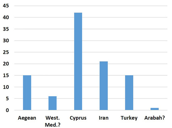 The situation is not dissimilar in the MBA. Zofia Stos-Gale [100] has identified the lead isotope signature of the copper in 47 (52.81%) of 89 sampled objects from Lapithos as inconsistent with Cypriot ores and likely coming from sources in Iran, Turkey, and the Aegean (see also [14] (pp. 388–392, Tables 2–4) and [15] (p. 116)) (Figure 12). Indeed, according to Stos-Gale [15] (p. 111), only 67% of all analysed copper-based artefacts from EBA–MBA Cypriot sites more generally are of copper of local origin. The Lapithos objects include spearheads, knives, axes, tweezers, a chisel, an awl, and pins of copper, arsenical copper, and tin bronze. They are, for the most part, of undoubted Cypriot types and include artefacts, for example mushroom-headed eyelet pins, which are almost exclusively found at Lapithos and likely to have been produced there. It would appear that significant quantities of copper from foreign sources may have been used alongside copper from local ore bodies to produce objects in MBA workshops at Lapithos.