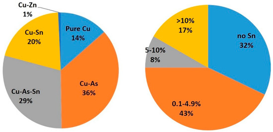 The amount of tin entering Cyprus in the MBA has also been significantly under-reported. Balthazar, whose 1990 volume on EBA and MBA Cypriot metalwork included a study of all previous analytical work, concluded that tin bronze did not become common until the end of the MBA [94] (pp. 161–162). Similarly, Swiny [103] (p. 76) reported only 47% of alloyed metal in his MC sample, a far lower rate than in Anatolia or the Levant. Recent portable X-ray fluorescence (pXRF) analyses undertaken by Andreas Charalambous [13] of the University of Cyprus on 408 artefacts from MBA tombs at Lapithos have, however, identified 36% as arsenical copper (Cu–As), 29% as arsenical bronze (Cu–Au–Sn or Cu–Sn–As), and 20% as tin bronze (Cu–Sn) alloys, with only 14% of the assemblage of pure copper (Figure 13 left). While we need to take into account the limitations of pXRF, which examines only the surface of an object where some alloyed metals are more or less abundant than others [104] (p. 225), similar analyses elsewhere have proved successful in identifying the major alloyed elements in prehistoric artefacts, while tending to overestimate the proportion of secondary metals [105] (p. 57). With due caution with regard to the latter, Charalambous’ analyses show that 68% of analysed artefacts contain tin (Sn): 43% registered as between 0.1 and 4.9%, 8% between 5 and 10% and 17% over 10% (Figure 13 right). Thus, some 20% of the assemblage can be considered tin bronze (defined as greater than 2% tin, see [84] (p. 97)) or arsenical tin bronze (29%), and at least 17% as high tin bronze. It would appear that tin bronze, arsenical bronze, and arsenical copper were in widespread use at Lapithos in the MBA.