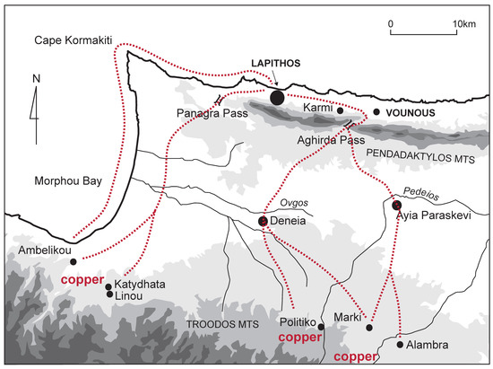 The evidence from Ambelikou is also instructive. Here, a permanent settlement with workshops for smelting, casting, and the production of ingots, as well as pottery production, was located adjacent to a mine in the MBA [7]. While the site’s closest ceramic relationships were with nearby communities at Katydhata and Linou in the Karkotis Valley [7] (p. 222), which were probably also engaged in mining and smelting, the strongest extra-regional connections were with Lapithos. The almost complete absence of ceramics from Deneia at Ambelikou and in the Karkotis Valley suggests, however, that copper was not shipped northward via the Agirdha Pass but by sea via Cape Kormakiti, or overland via a route running inland from Morphou Bay through the Panagra Pass [7] (pp. 220–221) (see Figure 16). The presence, similarly, at Ambelikou of some vessels from the west suggests connections with the Khrysochou Bay area [7] (pp. 78, 95–98, 223). The miners and smelters at Ambelikou were clearly producing metal for distribution beyond the site. While most ingots probably made their way to the north coast, the presence of western goods suggests that metal was also traded out to the west and thus that the community at Ambelikou enjoyed a degree of autonomy in the management and distribution of their products.