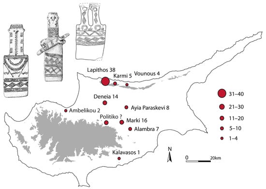 One class of object, likely to have been of significant symbolic value, appears to have been moving outward from Lapithos within a specific operational network. These are terracotta ‘plank figures’ which average 25 cm in height and depict flat, stylised figures wearing elaborate jewelry and decorated garments. Variants include figures holding infants and two- or three-necked figures. While the question of what or who they depict—deities, ancestral figures, or human agents—remains open, they were clearly associated with ritualised activity in mortuary contexts [141]. Some 40% of provenanced examples have been found at Lapithos, and only Lapithos has produced the full range of types (Figure 18). This suggests production at this site, at least initially. Elsewhere, they occur at Deneia and Ayia Paraskevi and at the smaller villages of Marki, Alambra, Politiko, and Ambelikou, where the presence of more crudely modelled figurines, which emulate imported plank figures (e.g., [47] (pp. 156–157, Figure 5.3)), suggests that they had a significant local impact. The down-the-line movement of these high value items implies greatest connectivity between Lapithos, Deneia, and Ayia Paraskevi and sites between these nodes and the ore bodies. This highlights the role played by the north coast in the materialisation of symbolic ideas within this network.