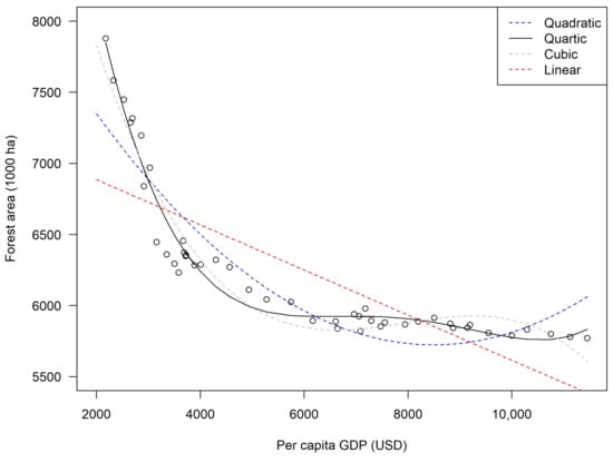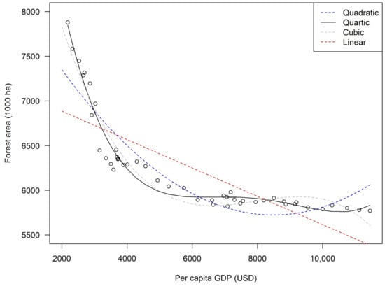 First, by setting forest areas in 1000 ha as a dependent variable and per capita GDP (in constant 2010 U.S. dollars) as an independent variable and using R software, we specified eight parametric regression models. Figure 4 shows the results of four polynomial functions, namely, linear, quadratic, cubic, and quartic functions.