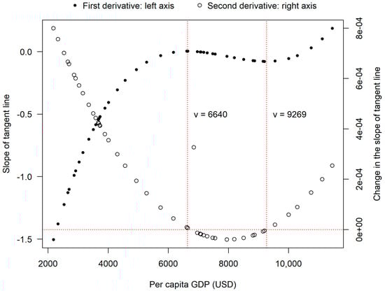 First-order derivatives (Equation (8)) show the slopes of the tangent lines or the rates of change for the quartic function, while second-order derivatives (Equation (9)) show the changes in the slopes of the tangent lines for the quartic curve. By plotting the results of Equations (8) and (9), as shown in Figure 5, we found the slopes of the tangent lines were negative, and forest areas decreased sharply until approximately $6000 of per capita GDP; after approximately $6000, the slopes of the tangent lines were still negative, but they were decreasing in absolute value and approaching zero. When per capita GDP reached approximately $6600, the slope of the tangent line became 0. After $6600, the slope of the tangent line began to decrease again, although slowly. This minor downward trend stopped at approximately $9000 and changed to an upward trend.