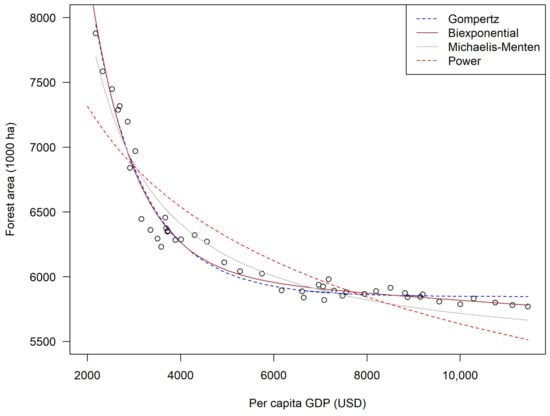 The approach of simulation models to establishing REDD+ baselines requires higher data availability and consistency than historical approach. However, if data are available, this research shows that, not only polynomial models, but also other parametric models, namely, power, biexponential, Gompertz growth, and the Michaelis–Menten models, and some nonparametric models can be the alternatives for simulating models. In the case of Peninsular Malaysia, model simulations may not provide better results than historical deforestation approach because a linear trend was confirmed since $8000 of per capita GDP. However, for a country where nonlinear dynamics were found as shown in Figure 1, the models adopted in this research may be useful to the curve fitting. Angelsen and Ainembabazi [] recommended to adjust to higher levels than historical deforestation to HFLD (high forest cover, low deforestation) countries, while to adjust to lower levels than historical deforestation to LFHD (low forest cover, high deforestation) countries. Biexponential, the Gompertz growth, Michaelis–Menten, power, and the Nadaraya–Watson kernel smoothing models may be used to set up a reasonable adjustment.