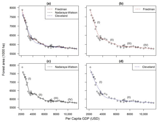 The results of the nonparametric models are shown in Figure 7 and Table 3. First, for the interval of more than approximately $8000 of per capita GDP, all three models almost overlapped and fitted well (Figure 7a). For the part of the curve in the interval of less than approximately $8000, the Friedman and Nadaraya–Watson models outperformed the Cleveland model. The Cleveland local regression model seemed to have over-smoothed the curve. Second, by checking Figure 7b,c, we perceived that the fitted curve might be divided into four sub-stages. Sub-stage I ended at approximately somewhere before $4000 of per capita GDP with a higher deforestation rate. This sub-stage may belong to Stage 2 of forest transition. Sub-stage II ended at approximately $7000, with a lower deforestation rate than sub-stage I. This sub-stage may belong to the latter period of Stage 2 or earlier period of Stage 3 of forest transition. Sub-stage III ended at approximately $8000, showing an approximately stable or horizontal trend. The last sub-stage, sub-stage IV started from approximately $8000. In this sub-stage, slight deforestation occurred. Sub-stages III and IV may belong to Stage 3 of forest transition. Generally speaking, except for the third sub-stage, all other sub-stages show an approximately linear and decrease trend in forest areas; however, the deforestation level was becoming increasingly lower. Figure 7d shows that the Cleveland model fitted the curve with two stages, both of which were approximately linear and may belong to the Stages 2 and 3 of forest transition, respectively.
