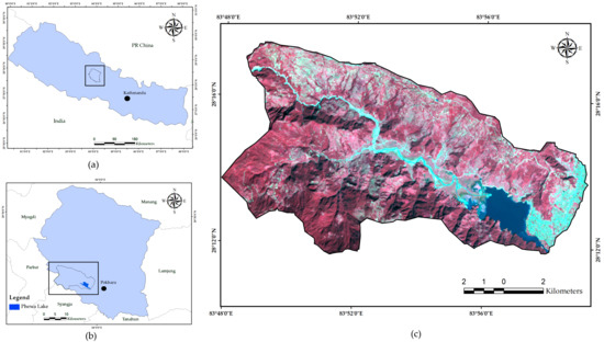 Map showing: (a) Kaski District within Nepal; (b) Phewa Lake watershed within Kaski District; and (c) a false color composition of Landsat 8 OLI (2017) subsetted to Phewa Lake watershed boundary.