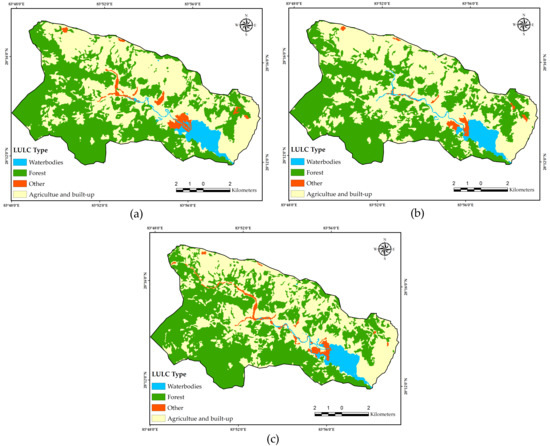 Multi-temporal Landsat images of 1995, 2005 and 2017 were independently classified and classification maps generated (Figure 3). Figure 3a–c depicts the spatial distribution of various land-use and land-cover types in Phewa Lake watershed for years 1990, 2005 and 2017, respectively. The results of LULC distribution for the three time points show that forest and agriculture and built-up were the dominant land-use/land-cover type in the watershed (Table 4). Forest cover was more prevalent on the southern part of the watershed and the upper slopes elsewhere, whereas agriculture and built-up was more prevalent on valley floors, hill terraces, and foot-slopes. Phewa Lake, located in the eastern part of the watershed, was responsible for most of the water cover in the area. Spatial distribution of type other (barren land, wetland, and grassland) shows that it is distributed mainly in the vicinity and along the waterbodies. Overall, over a duration of 22 years, forest cover increased while the area of all other land-use/land-cover types decreased.