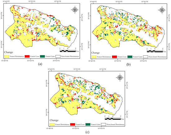 Forest cover changes in Phewa Lake Watershed during: (a) 1995–2005; (b) 2005–2017; and (c) 1995–2017.