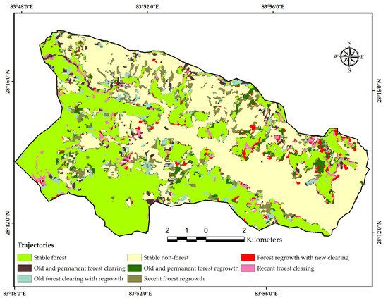 To better understand general trends of land-cover during two consecutive periods, an analysis of land-cover trajectories concerning forest cover changes was carried out. The concept and methodology of land cover change trajectory have been developed already [18,66,67]. Here, trajectories of forest cover change refer to the successive transitions between forest and non-forest cover categories over the observation years. Following Mertens and Lambin [18], all possible land-cover trajectories (T = nx, where n is the number of land cover classes and x is the number of observation years) were reduced to eight main sequences based upon the forest and non-forest categories (Table 3). The description of the trajectories in this study is based on the analysis of classified maps with only two binary aggregate classes (forest and non-forest) from the three observation years, but a particular transition (for instance, “forest” to “non-forest”) could have occurred anytime between the observation years. For estimation of the trajectories, the classified maps of 1995, 2005 and 2017 with the aggregate forest and non-forest classes were first vectorized and imported into ArcMap 10.2 as ESRI Shapefile (.shp) where they were successively intersected starting with the map of 1995. A trajectory map was created to visualize spatial trends of forest cover change.