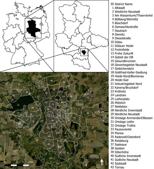 Halle (Saale) (51°29′49.129″ N 11°58′7.69″ E) is one of the largest cities of the state Saxony–Anhalt with 238,321 inhabitants and a total area of 13,502 hectares (Figure 1). Within an average diameter of 15 to 17 km, the city is characterized by a compact urban structure. As a former highly industrialized area in the period of the German Democratic Republic, the city has been successful in improving the quality of the built-up and natural environment today and has thus achieved a higher quality of living for its inhabitants [25]. Green corridors close to the city have important ecological and recreational functions and serve as a regional planning target [26]. The Saale river (especially the Saale–Elster meadow and Saale–Elster floodplain), as a green belt connecting Halle with Leipzig, historic parks and the forest heathland “Dölauer Heide” contribute to improving the green infrastructure of the city.