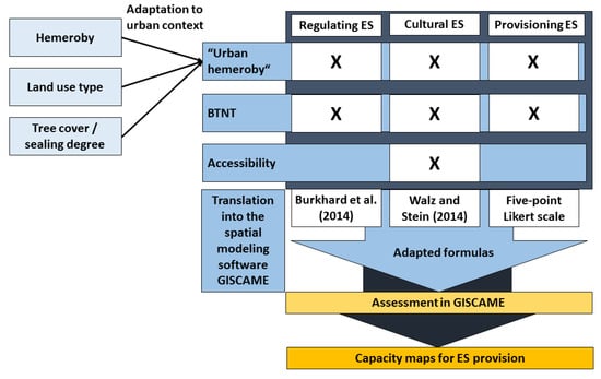 Different assessment methods, formulas and data types were necessary to adapt the hemeroby concept to the urban context in order to streamline the different ES provision levels and prepare data for GISCAME and QGIS (Figure 2). Seven regulating, cultural and provisioning ES were considered in the ES assessment (see Section 2.4 for more details). At first, the hemeroby concept was translated into the urban context by using the degree of sealed area and the degree of tree cover (“urban hemeroby” in Figure 2). The regional biotope and land use data set (BTNT) was used as the spatial basis for the study area. With regard to cultural ES, accessibility was also taken into account. In order to normalize all ES in GISCAME and use the values for capacity maps in QGIS in a later step, formulas in combination with information from Burkhard et al. (2014) [31] and Walz and Stein (2014) [32] were used. Regarding provisioning ES, a five-point Likert scale was chosen.