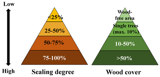 Steps of the sealing degree and wood cover according to the regional biotope and land use data set for built-up areas [35].