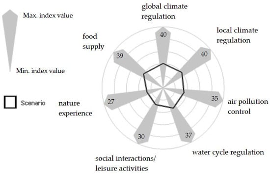 In the following, the hemeroby index values presented in Table 5 were used as an initial value which reflects the tendency to the provision of regulating ES. However, the same hemeroby degrees would be assigned to different land use types that are not comparable with regard to ES provision. In order to bring hemeroby into an ES context, the “Burkhard Matrix” [31] was used. This matrix represents a qualitative assessment of the capacity of ES provided by different land use types. The assessment scale ranges from 0 (no relevant capacity) to 5 (very high relevant capacity). Evaluations of ES capacities refer to a central European normal landscape [31].