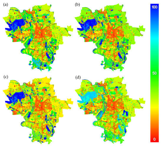 For example, green urban areas are assessed with the value 2 in the Burkhard Matrix for “global climate regulation”, while residential and mixed-used areas are assessed with 0. Therefore, we devalued the urban hemeroby index value by 30% for green urban areas and for residential and mixed-used areas by 50%. The remaining values then resulted in the index value for the regulating ES “global climate regulation”. In the following is an example for a green urban area and for a residential area with an urban hemeroby index value of 4. In Section 3.2, the results of all ES and index values are presented.