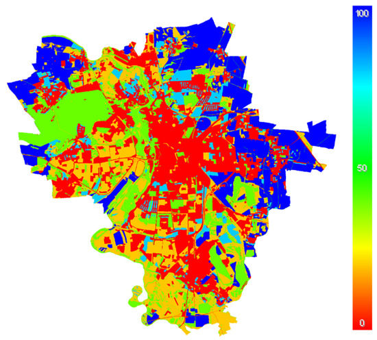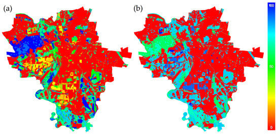 Based on the concepts presented by Jalas (1955) and Blume and Sukopp (1976) [20,33] (Table 1), we adjusted the hemeroby concept to better address the ecological contributions of urban areas for all types of use in the built-up area (green and open spaces, residential and mixed areas, industrial and commercial areas, allotments, allotment gardens, traffic areas, sports, leisure and camping facilities and other areas of the built-up area). Therefore, the hemeroby degrees from “β-euhemerob—moderate-strong human impact” to “metahemerob—excessively strong human impact” were sub-classified in our approach (see Table 1). These urban land use types have been classified according to the indicators “degree of sealing” and “degree of tree cover.” As a result, green areas with the same sealing and tree cover ratio as residential areas are also assigned to the same hemeroby degree and, thus, the hemeroby assessment can only be compared for the respective biotope or land use type.