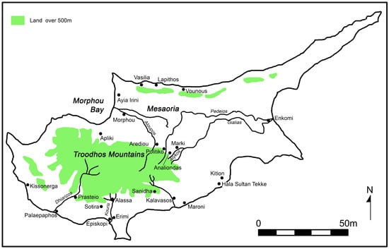 - Webb, J.M. Shifting centres: Site location and resource procurement on the north coast of Cyprus over the longue durée of the Prehistoric Bronze Age. Land 2018, 7, 64. [Google Scholar] [CrossRef]