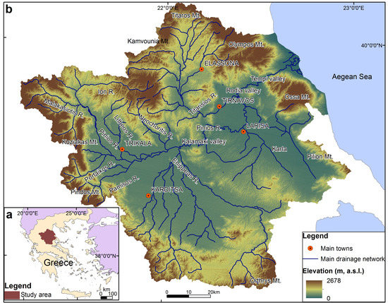 The drainage basin of the study area is located in Thessaly, central Greece (Figure 1a), and it covers an area of about 11,200 km2. The elevations of the study area vary from 0–2678 m a.s.l. (Figure 1b). The hydrologic basin is drained by Pinios River, which has an approximate length of 205 km. It is the third longest river in Greece and crosses a large part of the eastern part of central Greece discharging into the Aegean Sea, where it forms a delta.