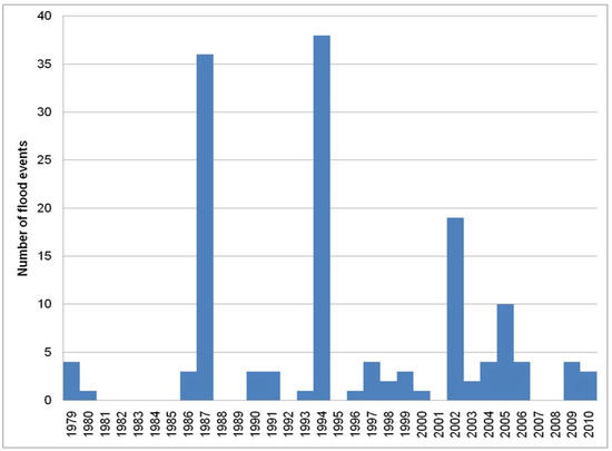 The number of flood events reached its maximum value (38) in 1994. The value of flood events was high (36) in the year 1987 and was relatively high (19) in 2002. In 1994, flood events were two-times higher than in 2002. In the 1980s, a total number of 40 flood events were recorded, while in the 1990s and 2000s, 55 and 47 were observed, respectively. Thus, there was a trend of increasing flood occurrences over the last two decades. The statistical analysis of the number of events showed that p = 0.009. Thus, the data used have values p < 0.05 and are statistically significant.