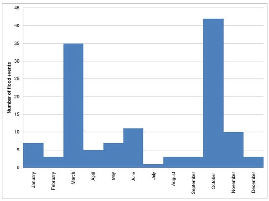 Figure 5 presents the seasonal distribution of flood events. The statistical analysis proved that October contained the most flood events (42). High values of flood occurrences were observed in March (35), in June (11) and in November (10). In October, the number of flood events was four-times higher than in June and November.