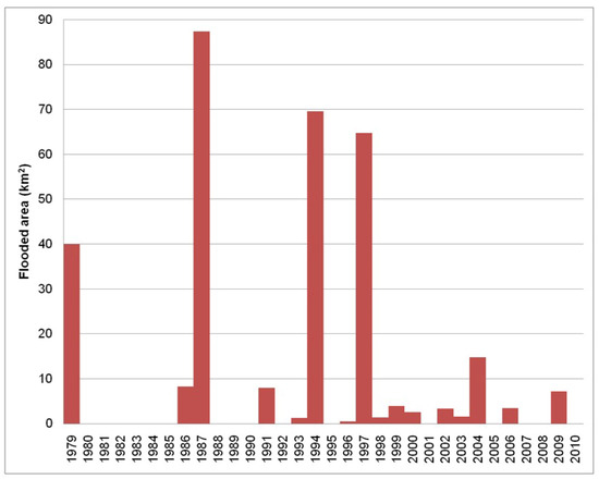 Regarding the flooded area, it reaches its maximum value (87.4 km2) in the year 1987 (Figure 6). This is attributed to flood event that occurred on 24–27 March 1987. The flood of March 1987 was caused by intense rainfall that produced direct runoff, as well as snowmelt. The water level of the Pinios River measured during the flood event exceeded 6.3 m in Kalamaki Valley and 8.0 m at Tempi Valley when the normal water level was less than 1 m in both locations (Figure 1b). Owing to the narrow riverbed at both locations (Kalamaki and Tempi), significant parts of the Thessaly plain upstream of each location were inundated [56].