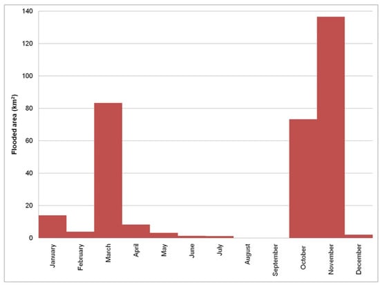 On the other hand, substantial differences appeared in the temporal distribution of the flooded area (Figure 6). It reached its maximum value (87.4 km2) in 1987. Additionally, relatively high values were calculated in the years 1994 (69.5 km2) and 1997 (64.8 km2). The p-value was found to be 0.01, and thus, the data used were statistically significant. Regarding the seasonal distribution of flooded area (Figure 7), it reached its maximum value (136.5 km2) in November. It presented relatively high values in March (83.2 km2) and October (73.1 km2).