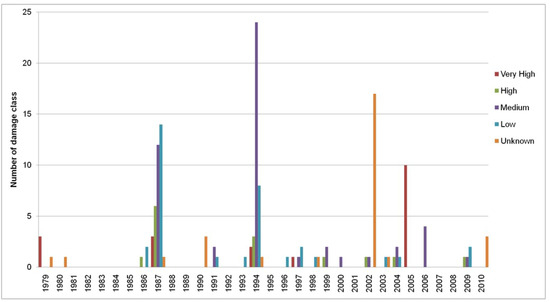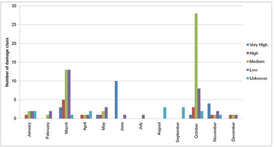 Figure 10 and Figure 11 show the temporal and monthly distribution of categories of damages in the study area. The maximum value (10) of the very high category was observed in 2005, whilst its relatively high values were recorded in the years 1979 (three) and 1987 (three). Moreover, this category reached its maximum value (10) in June; a relatively high value (four) was calculated in November. The high class of damages reached its maximum value (six) in 1987 and a relatively high value (three) in the year 1994. March contained most records (five) of this class, and a high value was computed in October. The medium class reached its maximum value (24) in 1994, and a high value (12) was observed in 1987. The month with the most records (28) of this class was October; while a high value (13) was calculated in March. The annual and monthly maximum values of the low damages were observed in the year 1987 (14) and in March (13). Finally, the maximum value of the unknown class was recorded in the year 2002 (17).