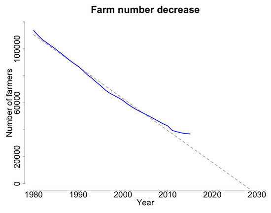 Despite these difficulties, the second half of the 20th century experienced an agricultural boom in Belgium as a result of technical progress and mechanisation, which increased productivity and turnover [4]. Additional support received through the first Common Agricultural Policy (CAP) of the EU also contributed to this boom. In parallel, noncompetitive and small farmers, unable to keep up with new necessary investments were driven out of agriculture. For the farmers that managed to continue farming, the pressure remains: urbanisation remains an attractive economic alternative to agricultural land and competition might further increase with the further phasing out of some of the trade barriers by the CAP under pressure of the WTO [48] and with the further decrease in subsidies from the CAP after 2020 [49,50]. Moreover, price fluctuations in the market can have a strong and immediate impact, and stricter environmental policies put new constraints on established farming techniques. Additionally, the possible role of climate change remains uncertain [4,11,51,52,53]. This requires farmers’ to constantly adapt and invest thus creating lasting land use changes on agricultural land. This continued pressure caused a further decline of farms by 70% between 1980 and 2015, an average of six farms per day [54]. A simple linear extrapolation of this trend would imply that no more farmers would remain by 2028 (Figure 4). Although this linear extrapolation is a simplification as the decrease might tail-off, it still gives a general idea on the speed of the decrease over the last decades and highlights the urgency of the necessity of a policy change, to curb this dramatic decline.