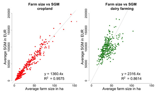 Relation between average standard gross margins (SGM) and average farm size for cropland (left) and dairy farming (right) in Belgium on the municipality level.
