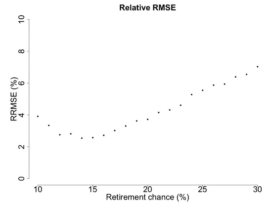 Calibration through the relative root mean square error (RRMSE) for different percentages of retirement after legal retirement age.