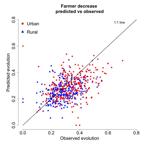 Observed vs. predicted percentage of farmer decrease between 2000 and 2010.
