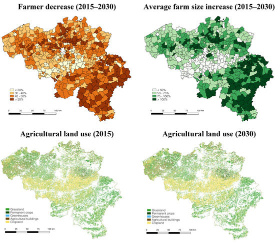 Results of runs of the model until 2030 with the percentage of decrease of number of farmers between 2015 and 2020 (upper left), the percentage increase of farm size between 2015 and 2030 (upper right) and the agricultural land use in 2015 (lower left) and 2030 (lower right).