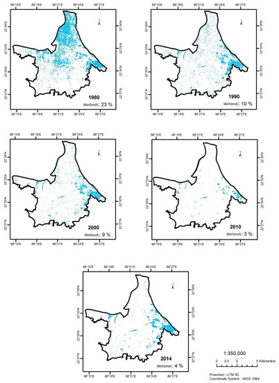 Distribution of wetlands (blue patches) within Kolkata Municipal Corporation area (KMC) area from 1980 to 2014 (decade-wise) (Data base courtesy: Satellite Image interpretation from Landsat (USGS) and LISS III series (ISRO, India) and the Govt. of West Bengal, India).