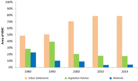 For the Kolkata Municipal Corporation area (KMC) the three major land use classes (1) urban settlements, (2) vegetation patches, and (3) wetlands were mapped in five time slices covering the period from 1980–2014. During this time the spatial patterns of these major land use classes show distinct changes: In 1980 the urban settlements covered 49% of the total KMC area while in 2014 it almost captured the whole KMC area covering 79% (161.91 Km2) of the total area (Figure 4). The urban settlements area under the KMC only slightly increased (2%) between 1980 and 1990, transforming from 100.17 Km2 to 103.89 Km2. Between 1990 and 2000 the urban settlements area increased abruptly, covering 71% (145.34 Km2) in 2000 followed by an additional increase of 7% until 2010 (78% or 162.08 Km2 of the total area of KMC; Figure 4). Within the whole study period (1980–2014) the space occupied by the wetlands decreased from 47.15 Km2 to 8.70 Km2 and that covered by vegetation patches from 58.60 Km2 to 35.31 Km2 (Figure 5).