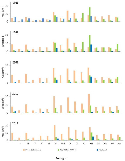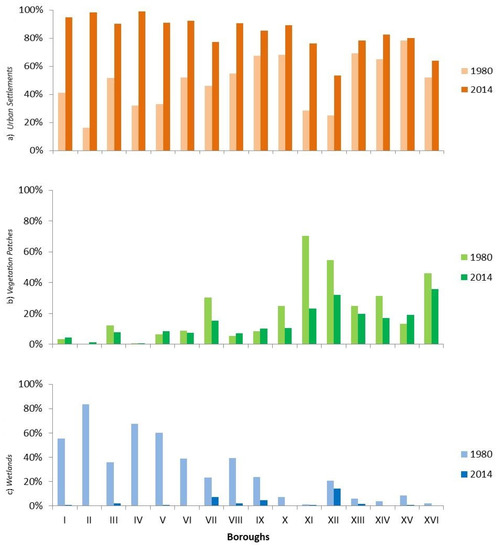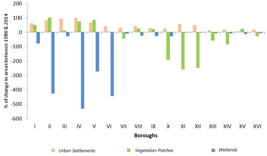 The relative change of the distribution of each major land use-land cover class was calculated dividing the difference in area coverage between 1980 and 2014 by the area covered by the respected land use-land cover class in 2014. The positive results of a class signify the increase whereas the negative results indicate the decrease in areas between 1980 and 2014 (Figure 10). Areas covered by wetlands show the highest relative decrease in distribution; in boroughs I to VI the areas under the coverage of any lake, ponds, or other surface waterbodies in 1980 changed until 2014 either into urban settlements or vegetation patches. The distribution of vegetation patches declined in the boroughs X, XI, and XII between 1980 and 2014, being transformed into urban settlements. The change for the vegetation patches were major in the boroughs of II, VI, and V. Simultaneously, a continuous and stable process of urbanization occurred in boroughs X–XVI. Nevertheless, the areas covered by wetlands were mainly changed in the boroughs I–VIII (Figure 10).