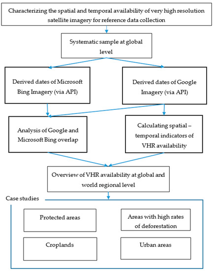 The methodology used in this paper is summarized in Figure 1. Starting with a systematic sample, the dates are extracted from Google Earth and Microsoft Bing Maps as described in Section 2.1. This data set is then analyzed for overlap, and a variety of spatial and temporal indicators of VHR availability are calculated (as described in Section 2.2) in order to provide a global and world regional overview. Finally, a series of case studies have been selected, where the data extraction and processing is described in Section 2.3, Section 2.4, Section 2.5 and Section 2.6.
