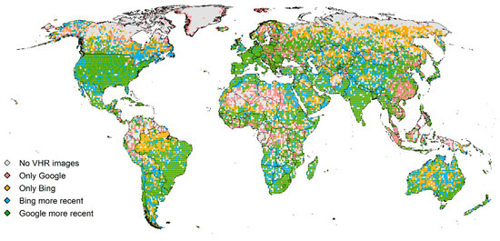 The worst coverage can be found in North America, where only half the area is covered by VHR imagery in both Google Earth and Microsoft Bing Maps, and eastern Europe, where Google Earth has only 39% VHR imagery and Microsoft Bing Maps has 58%. This is probably due to the fact that these regions cover high northern latitudes, where there is lower availability of VHR imagery (Figure 4). In contrast, Google Earth has better coverage in northern European, south-eastern Asia and middle Africa compared to Microsoft Bing Maps.