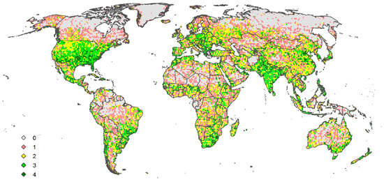 Seasonal patterns are also evident in the historical archive of Google Earth. Figure 6 shows the availability of VHR imagery according to the number of seasons represented. Very few places have imagery from all 4 seasons (winter, spring, summer and autumn) while 3 seasons are available in majority of the USA, India and eastern Europe, mirroring the pattern found for the number of images.