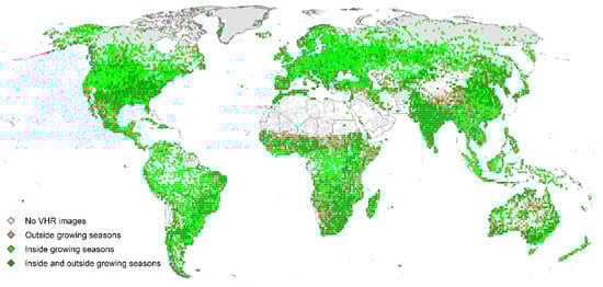 The distribution of VHR imagery (<5 m) in Google Earth based on the availability in and outside of a growing season. Areas in white, e.g., in the Sahara desert, were excluded since there is no data available due to absence of cropland (Software: Esri®ArcMap™ 10.1).