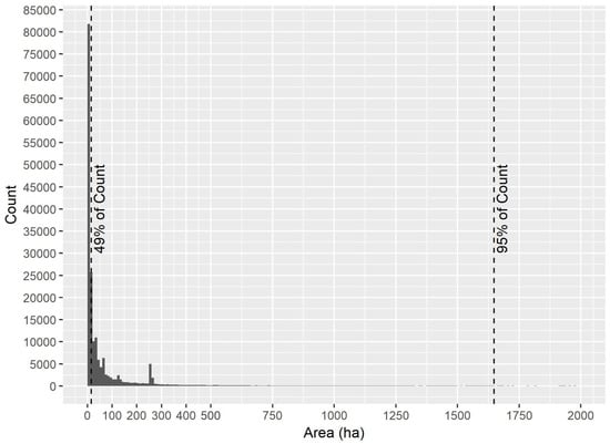As noted in their metadata, PADUS is subject to errors of omission and commission. Some of the errors they report are due to overlap—topology—and they mention “slivers” specifically. We observed that some of the smallest polygons in the dataset were geoprocessing artifacts, including slivers []. These were typically very small, but the smallest records in the PADUS were a relatively minor portion. For example, 2.4% are <0.1 ha in size. On the other hand, many very small polygons are legitimate conserved parcels. Many records (27,338 or 14.1%) were less than 1 ha and distinct parcels, as illustrated in Figure 3. While many of the small records have attributes indicating they are conservation easements or small parks, others may not be real or their spatial attributes may be inaccurate; investigating the characteristics of these parcels is an important research question, because while most are conserved areas, others may have inaccurate spatial information and influence the size distribution. Another source of error could be lack of clarity over what constitutes a separate protected area in an ownership sense, as distinct from a polygon sense. For example, the database has some records that are split polygons, so that one continuous protected area is represented by two records.