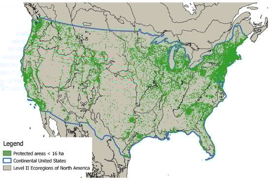Considerable cost is incurred in establishing and managing small protected areas []. Aside from their sheer number and costs of acquisition, smaller areas may cost more to manage than larger ones due to the challenges of having management tasks distributed. On the other hand, smaller areas arise from local concerns and may serve local purposes better than larger, more distant areas. Small parks and private conserved lands are typically generated and managed at the local scale—as in counties, states, cities, land trusts, landowners, and indigenous people. These include the bulk of conservation easements, local parks, historical and archaeological sites, private reserves, wildlife refuges, and community forests [,]. One drawback is that some would not be considered by international bodies to be areas whose primary purpose is biodiversity conservation. If they maintain natural land cover and are unable to be developed, they nonetheless function to exclude conversion to development. Furthermore, they often have specific conservation goals, and these include those related to biodiversity [,].