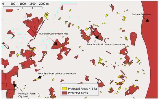 A portion of Cape Cod, USA, showing extremely small conserved parcels <1 ha, in yellow, in a matrix of slightly larger projects typical of those discussed in this paper. A selection of parcels is labeled to show the types of conservation lands in this landscape. Even the <1 ha areas have “conservation” designations in the database, i.e., are not data anomalies. To what extent small protected areas perform landscape-level biodiversity functions is largely unknown. QGIS V 3.2.