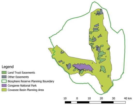 The region shown in Figure 4 has two overlapping planning areas: an International Biosphere Reserve and a landscape-level alliance or Task Force. Both planning areas share members, for example, from the National Park Service, Congaree Land Trust, and state agencies. The idea is to increase cooperation to achieve landscape-level conservation goals. The hope is that even though the protected areas are small, their collective impact may be increased by better management of un-conserved lands, while preserving local resource-based economies. Similarly, community conserved areas (CCAs) are a global phenomenon that provide biodiversity services while satisfying the needs of local and indigenous peoples. They are not very well understood in terms of their overall contributions to biodiversity conservation, but due to their extensive coverage (as much as 11% of global forests), are an example of how relatively small, local projects can accumulate effects []. These approaches can be facilitated by landscape-level cooperatives and alliances, especially if they respect human dimensions. For example, in governance of conservation networks, recognizing and trading leadership roles based on what is needed to accomplish particular goals is better than traditional, top-down management [].