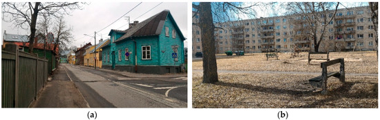The residential districts or microregions found in Soviet-era cities, providing mass-housing with basic consumer services, were known as the mikrorajon, and represented the “basic building block of the Soviet city” [66] (p. 75). These are very common in Estonian cities, for example, in Tartu, the second biggest city of Estonia. Constructed from the late 1950s through to the 1980s, most of the new housing consisted of Soviet-type brick or concrete panel dwellings [67]. In Estonian cities, it is possible to identify a trend in housing occupancy related to the different ethnic groups [68]. In general, Estonians live in single-family houses, while Russians (or Russian speakers—they may also have Belorussian or Ukrainian, etc., origins) occupy the high-density flats built during the Soviet Union (Figure 1). However, Kulu [69] admits that, for example, in late-Soviet Tartu, in spite of the fact that Estonians generally had more living space than non-Estonians, in the case of facilities, the situation was the opposite—non-Estonians had more facilities, even when housing ownership was controlled. These differences were due to the differences in preference for housing between ethnic groups, and also by the Soviet policy for social housing [68]. However, Kährik and Tammaru [70] admit that these neighbourhoods have still a “strong social mix, and do not reveal clear signs of decline” (p. 215).