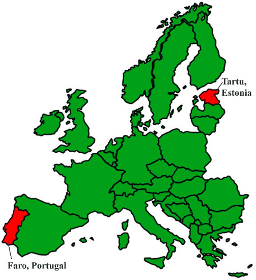 The data used in this paper were gathered from Tartu City, Estonia; and Faro, Portugal (Figure 2). Estonia is a Northern European country located on the eastern coast of the Baltic Sea. It is a small country of approximately 45,227 km2 in area, and around 1.3 million habitants, and is one of the most forested countries in the Europe Union [37]. During the Soviet period, between 1944 to 1991, the majority of the Estonia’s cities, including Tallinn and Tartu, developed according to the principles of the socialist city, as discussed above. The urban planning and construction system during the Soviet period favoured the development of large homogeneous areas, composed of extensive areas of multi-storey housing blocks [67].