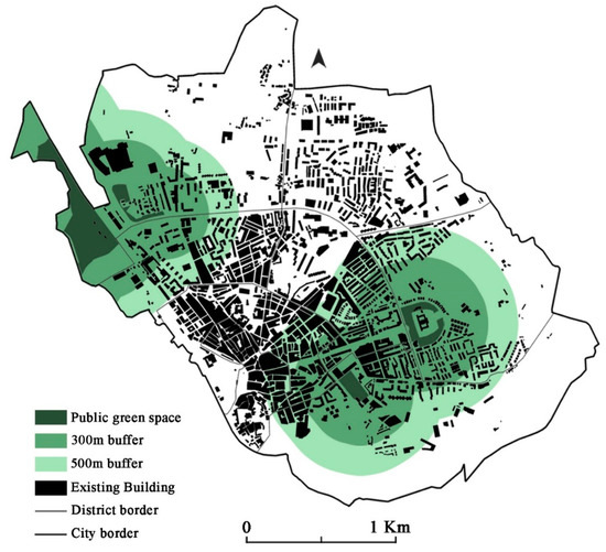 The accessibility of PGS was measured using the walkability distance method, with buffers around the green spaces and within the administrative boundaries of 300 m (4-min walking distance) and 500 m (approximately 7-min walking distance). There are several variations in the literature regarding the minimum distance that a public green space should be from the place of residence [35,45,48]. For that reason, we considered it appropriate to use the two buffer distances and make a comparison of the results.