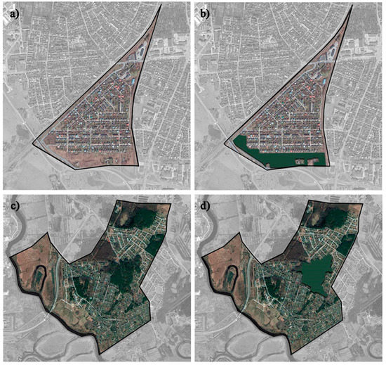 Proposal for new green infrastructure using the “Tartu Linna Üldplaneering”, a general plan for 2030. (a) Variku before; (b) Variku after; (c) Ihaste before; (d) Ihaste after. (Source: Satellite image from Google Earth).