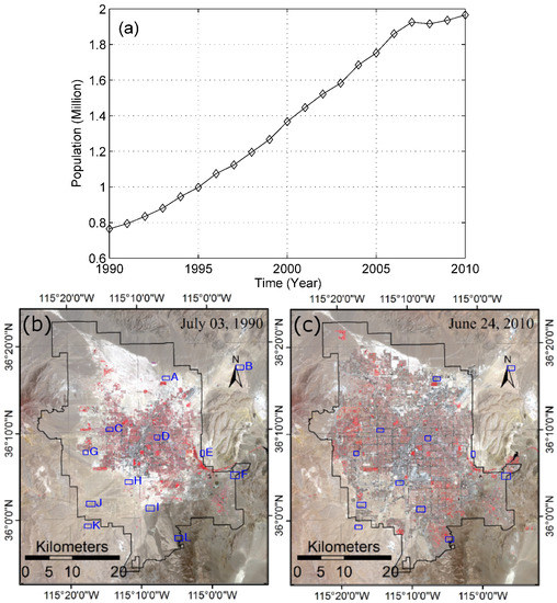 Las Vegas, since its establishment in 1905, has seen spurts of growth stimulated by events such as construction of Hoover dam and the legalization of gambling. In other times, it has continued to attract a population seeking a warm and dry climate, especially senior citizens [1,47,48]. More recently, it was among the fastest growing urban areas. Las Vegas’ population almost doubled during 1990–2010 period accompanied by a rapid urban expansion. Many new residential and commercial developments appeared along with many recreational areas such as golf courses and parks. Figure 1a shows the trend of population increase between 1990 and 2010 [49] and Figure 1b compares corresponding TM false color composite images (i.e., color assignment of red, green, and blue to Bands 4, 3, and 2, respectively), where red shade reflects the vegetation. The two decades considered in this article represent the period of rapid growth of Las Vegas that slowed down due to 2007–2009 recession. This study is a part of urban land cover analysis conducted for Nevada Division of Forestry to understand the role of urban forestry efforts in relation to urban climate during the rapid growth period. Clearly, the doubling of population has resulted in comparable urban expansion. The spatial patterns in TM images illustrate changes in several land cover types such as roads, high density buildings, and open spaces. Figure 1b also depicts 12 sites (A through K) chosen to understand the effect of NDVI on temperature. These sites represent various changed and unchanged land covers between 1990 and 2010 period.